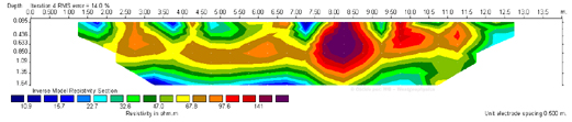 Este modelo permitiu também determinar o nível  freático, que corresponde ao topo do intervalo azul-escuro em baixo, estando a uma  profundidade média de 1.50m.